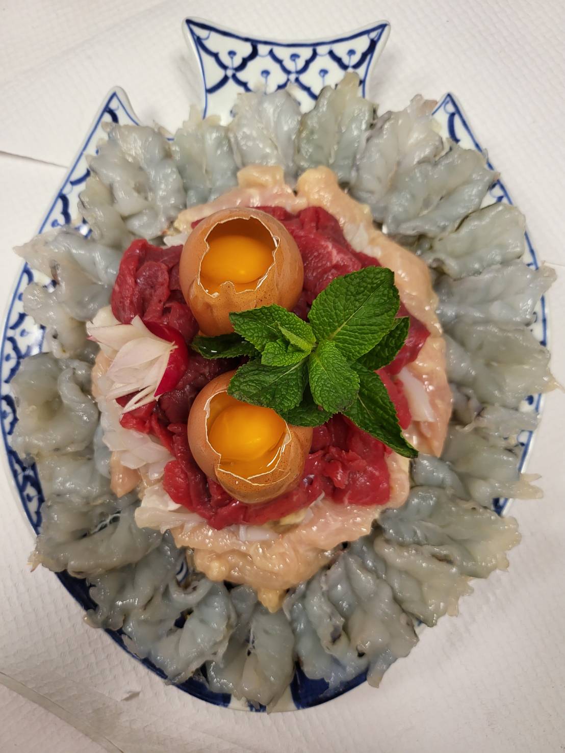 ENTRÉE AU CHOIX : Tom Yam Kung (piquante niveau 1), Salade Chapkam. PLAT AU CHOIX : Crevettes à la sauce saté. Boeuf ou crevettes au basilic Thaï. Pad Ha Sahaï. (Sauté de crevettes, poulet, bambou, champignion, ciboulette) ACCOMPAGNEMENT AU CHOIX : Nouilles sautées aux légumes Riz gluant. Riz aux crevettes. DESSERT AU CHOIX : Glace 3 boules. Beignet de banane ou ananas. Beignet de banane ou ananas (flambé supplément 2.50€), Ananas ou mangue fraîche. |