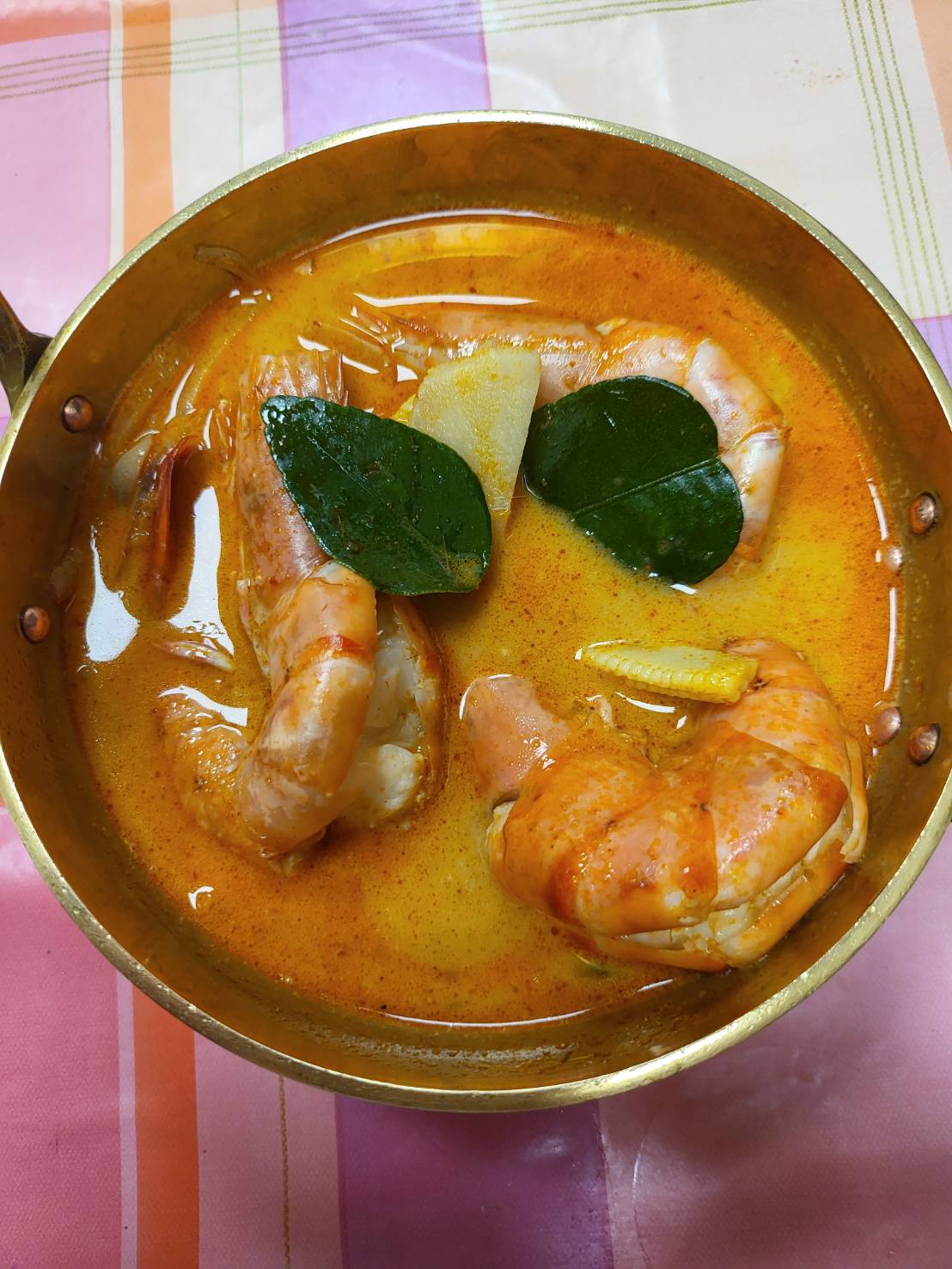 | (Gambas, noix de Saint Jacques et curry rouge) | |